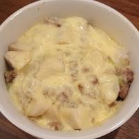 フライパンで挽き肉→ネギ→さといもの順に入れて炒め、調味料を入れて絡めてから220度のオーブンレンジで8分ほど焼きました。