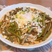 わらびに山菜をアレンジで追加して、細麺のうどんで食べました!トッピングも僕の好きな材料だったので、美味しかったです!