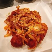 - 4 ケチャップ、ウスターソース、赤ワイン、塩を入れ、1のから揚げを入れ軽く炒めます。