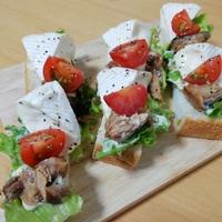 カマンベールチーズとサバの味噌煮缶の旨味が合わさって、マイルドなコクが美味しいスティックオープンサンドです。 サバの味噌煮缶を使用することでとっても簡単です。ボリューミーで見た目も華やかなので、皆でわいわいつまめる一品ですよ。おつまみとしてもオススメです。是非、お試し下さい。