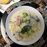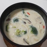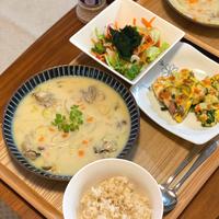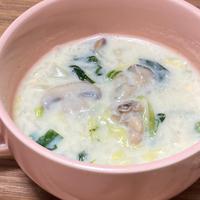 牡蠣、玉ねぎ、白菜、ほうれん草、マッシュルームで作りました。水&牛乳を多めにして、シチューではなくスープにしました。