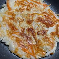 - 3 弱火で熱したフライパンにオリーブオイルをひき、2を全体に広げ入れて5分程焼きます。焼き色が付いたら裏返して2分程焼き、火が通ったら火から下ろします。