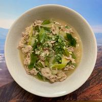 - 3 鍋にごま油を入れて中火で熱し、(A)と2を入れて炒めます。豚バラ肉の色が変わったら1を加えて炒め、長ねぎがしんなりしたらスープの材料を加えて、ひと煮立ちさせます。アクが出てきたら都度取り除きます。