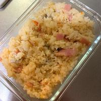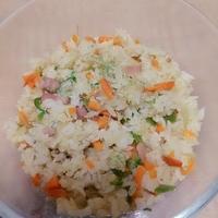 - 3 具材に火が通ったらごはん、コンソメ顆粒を加えて全体に味がなじむまで炒め、火から下ろします。