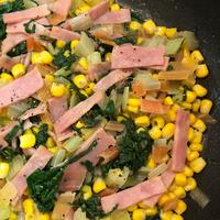 - 5 2を加えて中火でしんなりするまで炒めたら、塩、黒こしょうを入れて全体に味が馴染むよう炒め合わせたら火から下ろします。