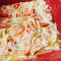 - 5 中火に熱したフライパンにオリーブオイルを入れ、3と4を入れ、エビに火が通るまで炒めます。