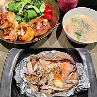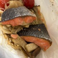 玉ねぎ・しめじ・えのき・豆苗を使用。鮭は切らずに包み焼き。鮭も美味しかったですが、野菜が凄く美味しかったです。ゴマがきいてます。
