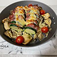 - 4 スキレットに1を乗せ、ズッキーニの切れ込みの間に3を挟みます。挟んだ後に回りに2を置きます。
