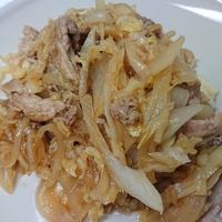 野菜から水分が出るから油は半量で肉と玉ねぎを同時に投入でよく炒めキャベツは後入れ。