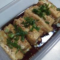 揚げ焼きした豆腐に、たれの半量で絡め下味をつけ、さらに食べるときに残りの半量のたれをかけ、七味をかけていただきました😊🎶