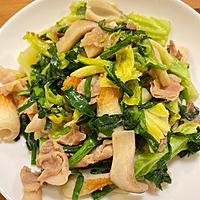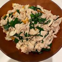 - 5 中火に熱したフライパンにごま油、2を入れ香りが立ってきたら、4を入れ豚バラ肉の色が変わるまで炒めます。