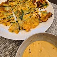 市販のチヂミ粉無くても片栗粉と小麦粉で美味しい海鮮チヂミが出来ました🎵キムチマヨソースも、チヂミに合っていて美味しかった😆💓アッサリ系のツケダレは、ポン酢とコチュジャンで作りました✨