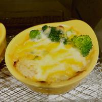 - 5 耐熱皿に4、3を入れ、ピザ用チーズをのせ、オーブントースターでこんがりと焼き色がつくまで、10分ほど焼きます。