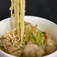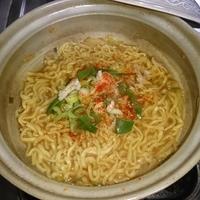 - 5 〆のラーメンを作ります。別の鍋にお湯を入れ沸騰させ、麺を入れほぐしながら3分間ゆでたら湯切りします。4の残った土鍋に入れて、「みそ油そば」にしてお召し上がりください。