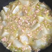 - 4 ひと煮立ちしたら1を入れ、蓋をして弱火で15分程煮ます。豚ひき肉とカブに火が通ったら火から下ろします。
