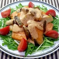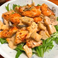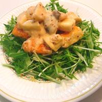 ヨーグルトとマヨネーズのソースがお店のような仕上がりで、しつこくない絶妙な味わいです。鮭はカリッと香ばしく焼き上げ、エリンギはプリプリとした食感が楽しめます。マスタードの風味がアクセントとなり、ビールのおつまみにもぴったり。水菜を添えることで彩りも良く、栄養バランスも◎。手間をかけたように見えますが、実は簡単に作れる一品です。