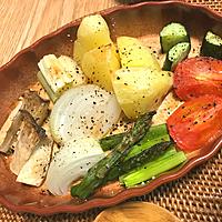 玉ねぎ、長ネギ、じゃがいも、アスパラはあらかじめまとめて6分間レンチン。エリンギ、トマト、きゅうりはそのまま並べて、オーブオイル、岩塩、ブラックペッパーをふりかけて220度のオーブンで14分。とてもおいしかった。