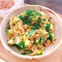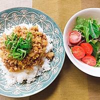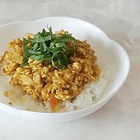 - 5 お皿にごはんをよそい、4をかけ、1をのせて完成です。