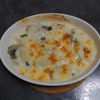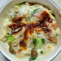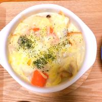 余ったシチューでも手軽に贅沢なグラタンに大変身!パンにシチューが染み込んでもっちりとした食感に、とろけるチーズの風味が絶妙にマッチします。しめじ、チンゲン菜、ブロッコリー、アスパラガスなど、お好みの具材をアレンジできるのも魅力。翌日のランチにぴったりな、程よいボリュームの一品です。チーズをたっぷり使えば子供も大喜びですよ。