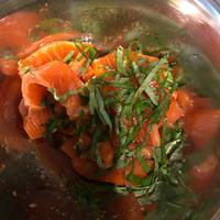 - 1 大葉は千切りにします。サーモンは5mm厚にスライスします。