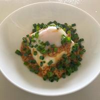 - 2 器に絹ごし豆腐を盛り付け、スプーンで真ん中をすくい、温泉卵を乗せます。