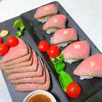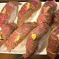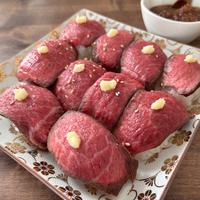 話題の肉寿司!お家で簡単にお店の味を再現してみました。 レアのジューシーなお肉と酢飯の絶妙なバランスがたまりません! 市販のお肉でも、簡単でやわらかく仕上がりますよ。 パーティーなどにもぴったりの一品です。