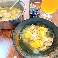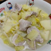 - 2 沸騰したら、じゃがいも、キャベツ、豚バラ肉、塩、水を入れ、蓋をします。