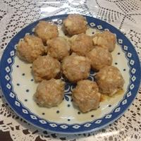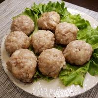 - 2 豚肉と塩こしょう・砂糖・醤油・ごま油を合わせよく馴染んだら1を加え更に混ぜ一口大に丸めます。