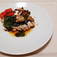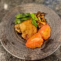 ただ付け合わせのトマトと茸や後乗せバジルが加熱されすぎて残念。フライパンに入れるタイミングは、もっともっと遅くするべきだった。