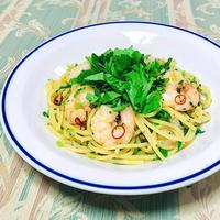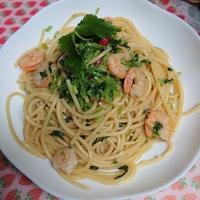三つ葉たっぷり 海老の和風ぺペロンチーノ レシピ・作り方