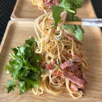 マ・マーの早ゆでスパゲッティを使ったのですぐできました!三つ葉がいっぱい食べられて美味しかったです。シーフードミックスでお手軽に作りましたが、ひとりランチの定番にします!