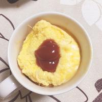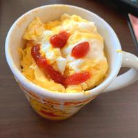 - 4 耐熱性のマグカップに入れ、マヨネーズを塗り、溶き卵を流し入れます。ふんわりとラップをかけ、600Wの電子レンジで2分加熱し、卵が半熟状になったらケチャップをかけて完成です。