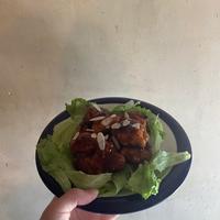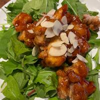 - 5 お皿にベビーリーフ、4を盛り付け、アーモンドスライスをかけて完成です。