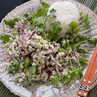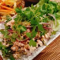 タイの北部の料理、ラープガイのご紹介です。煎ったお米を入れ、香ばしさと風味のあるエスニックなタレにパクチーとミントの香りがとても爽やかで鶏ひき肉のコクとよく合い、ついついお箸が止まらなくなりますよ。ごはんにも、お酒にも合いますのでおもてなしにも喜ばれます。ぜひ、お試しくださいね。
