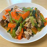 - 5 豚バラ肉に火が通ったら中火のまま2を入れて炒め、小松菜がしんなりしたら(A)を入れます。