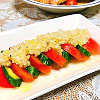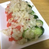新玉ねぎのシャキシャキとした食感と自然な甘みが特徴的なドレッシングが、トマトときゅうりの瑞々しさを引き立てます。レモンの爽やかな酸味と相まって、さっぱりとした口当たりに仕上がります。トントン野菜を切って並べるだけの簡単レシピなのに、イタリアンのような洗練された味わい。生ハムを添えればより本格的な一皿に。白ワインビネガーを使うとさらに風味が増します。