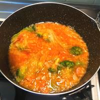 主人が豆苦手なので代わりにソ-セ-ジ、しめじを追加。トマト缶でなくても、十分美味しい💖