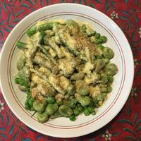 グリーンピースが大量に入手しましたので、空豆を加えて作りました。粉チーズと鰹節粉を振りかけて、美味しくいただきました。