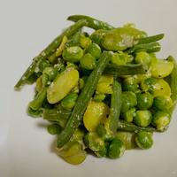 スナップえんどうはもうなかったけど、実家から送られてきたそら豆とグリーンピースに、さやいんげん入れて、作りました。簡単で美味しかったです。またこの時期になったらリピしたいです。