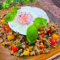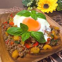 ナンプラーとバジルが香る本格的なエスニック料理を、手軽に作ることができます。豚ひき肉や鶏ひき肉を使い、パプリカの赤と黄色を組み合わせると彩り鮮やか。にんにくの風味とナンプラーの旨みが食欲をそそる絶品の一品です。お好みで唐辛子を加えてピリ辛にしたり、カシューナッツをトッピングしても美味。仕上げの目玉焼きと絡めて食べると、さらに美味しさアップ!