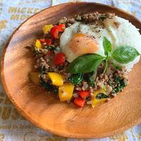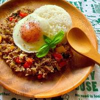 バジルのフライパン投入は、出来上がり直前にサックリと混ぜ合わせる程度にしてみたら、よりバジルの香りが引き立ったガパオライスになりました。