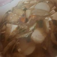かつおだしが香る上品な一杯で、大根、にんじん、白菜、里芋などの野菜の甘みが溶け出した優しい味わいです。具材は焼き豆腐やこんにゃくも加えてボリューム満点。ほわっと立ち上る出汁の香りと澄んだスープは体をほっこりと温めてくれます。素材の味を生かしたあっさり仕立てで、お好みで醤油を足して味を調整できます。唐揚げなどの濃い味付けのおかずとの相性も抜群です。