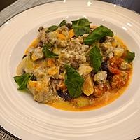 - 12 両面が焼けたら、豚ひき肉を軽く崩しながら火が通るまで中火で炒めます。白ワインを入れてアルコールを飛ばし、生クリームを入れて混ぜ、とろみが付くまで煮詰めます。