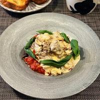 - 15 器に盛り付け、バジルをちぎりながらのせて完成です。