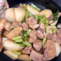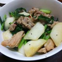 - 準備 カブは皮を剥き6等分にしておきます。カブの葉は2cm幅に切っておきます。鶏もも肉は一口大に切っておきます。