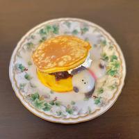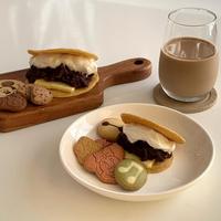 - 8 粗熱を取った6に1、つぶあん、7の順で乗せてもう一枚でサンドしたら、器に盛り付けて完成です。