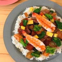 切って載せるだけの簡単レシピなのに、見た目は華やかで豪華な仕上がりです。サーモン、カニカマ、きゅうり、錦糸卵などの鮮やかな具材を自由にアレンジでき、さっぱりとした酢飯が具材の旨みを引き立てます。お刺身は漬け丼風にしたり、明太子やアボカドを加えたりとアレンジも自在。市販品を買わなくても、お祝い事やおもてなしにぴったりの一品に仕上がります。