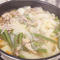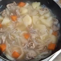 - 7 豚バラ肉の色が変わったら、水気を切った1、2、水、(A)を入れて、中火で煮立たせます。アクを取りながら、じゃがいもとにんじんに火が通るまで煮ます。塩で味を調え、火から下ろします。