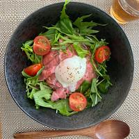 ちょっと贅沢なお昼ごはんや夕飯にピッタリです。 しゃきしゃきの玉ねぎの食感とわさびがピリッと効いていて爽やかなソースがジューシーなローストビーフによく合います。 お家で今はやりのローストビーフ丼を作ってみてはいかがでしょうか。