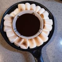 - 5 スキレットに溶かし有塩バターをキッチンペーパーで塗り、中央にココットを置きます。周りに1、マシュマロをのせ、ココットを取り出します。